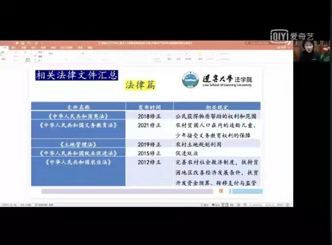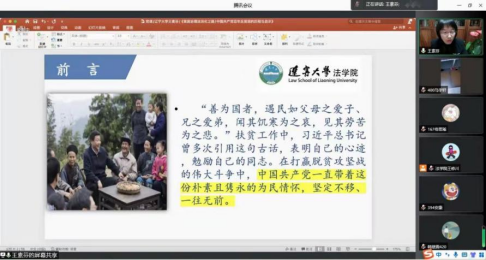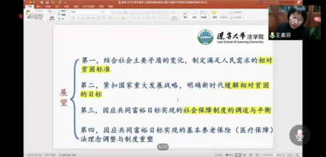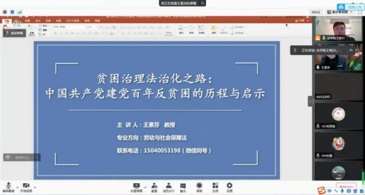 王素芬老师结合自身专业知识,回顾了中国共产党建党百年贫困治理走向法治化的历程,她讲到在打赢脱贫攻坚战的伟大斗争中,中国共产党带着朴素隽永的为民情怀,带领全国各族人民打赢了这场举世瞩目的脱贫攻坚战。