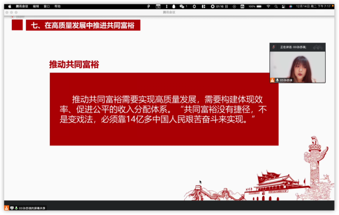 孙苏琪从八个方面介绍了党的十九届六中全会审议通过的《中共中央关于党的百年奋斗重大成就和历史经验的决议》。并指出全会聚焦总结党的百年奋斗重大成就和历史经验,强调“两个确立”,这体现了我们党重视和善于运用历史规律的高度政治自觉和牢记初心使命、继往开来的自信和担当。