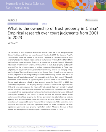 bat365在线官网登录入口博士生汪宓在杨松教授指导下,以独立作者的身份在Nature子刊Humanities and Social Sciences Communications(《人文与社会科学通讯》)上发表论文“What is the ownership of trust property in China? Empirical research over court judgments from 2001 to 2023”。