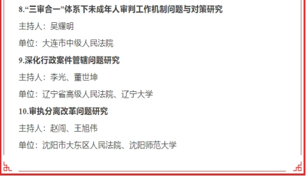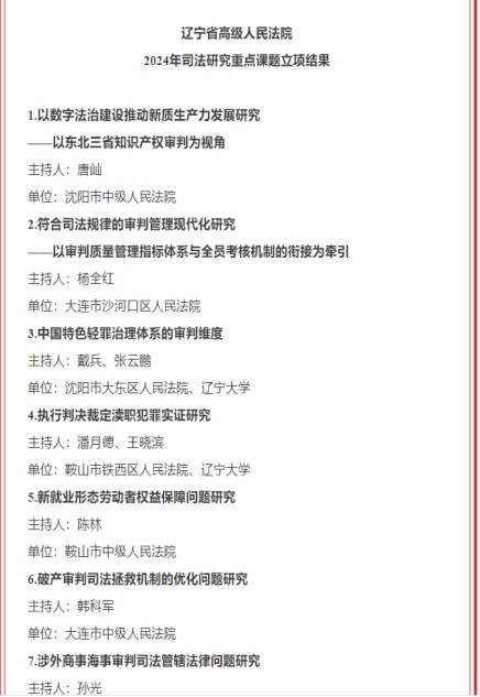 近日,辽宁省高级人民法院发布2024年司法研究重点课题立项公告,全省共10项课题获得立项,其中我院张云鹏教授、王晓滨副教授、董世坤副教授分别主持研究的《中国特色轻罪治理体系的审判维度》《执行判决裁定渎职犯罪实证研究》《深化行政案件管辖问题研究》3项课题获得2024年司法研究重点课题立项。