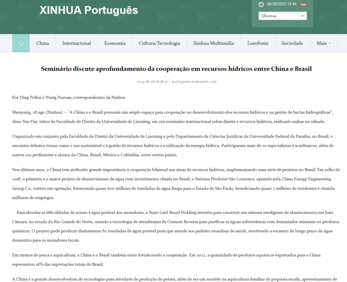 新华社(葡语)8月28日报道了bat365在线官网登录入口与巴西帕拉伊巴联邦大学法律科学中心共同举办的“法律与水资源国际研讨会”(International Conferenceon Law and Water Resources)。这是国家级媒体对bat365在线官网登录入口国际会议的首次报道。报道中介绍了中国与巴西在自然资源、能源领域中的合作,并强调本次研讨会不仅为中国、巴西、哥伦比亚和其他南美国家的法学家提供了一个深入交流和对话的平台,也向其他国家展示了中国的经验和智慧。